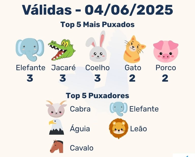 O Elefante aparece tanto como um dos mais puxados quanto como um dos que mais puxou outros animais. Isso mostra uma presença forte e contínua dele nos resultados, indicando que está em um ciclo de influência. O mesmo vale para Jacaré, que também aparece 3 vezes como puxado e está envolvido em 2 puxadas como puxador (diretamente ou indiretamente).