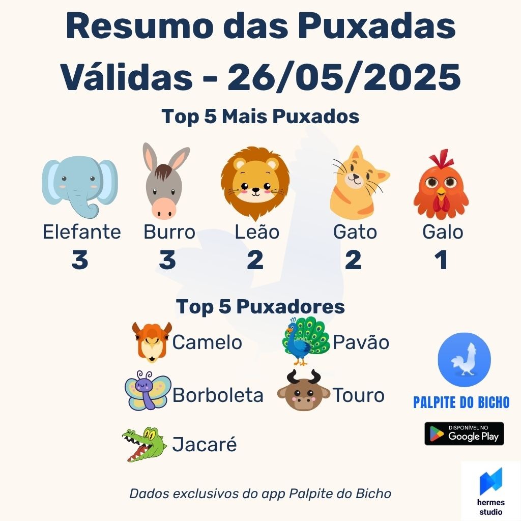 No dia 26 de maio de 2025, foram registradas 14 puxadas válidas em diversas loterias estaduais. O destaque do dia foi o Elefante, o animal mais puxado, aparecendo 3 vezes ao longo do dia. Já o animal com menor incidência foi o Galo, que apareceu apenas 1 vez.