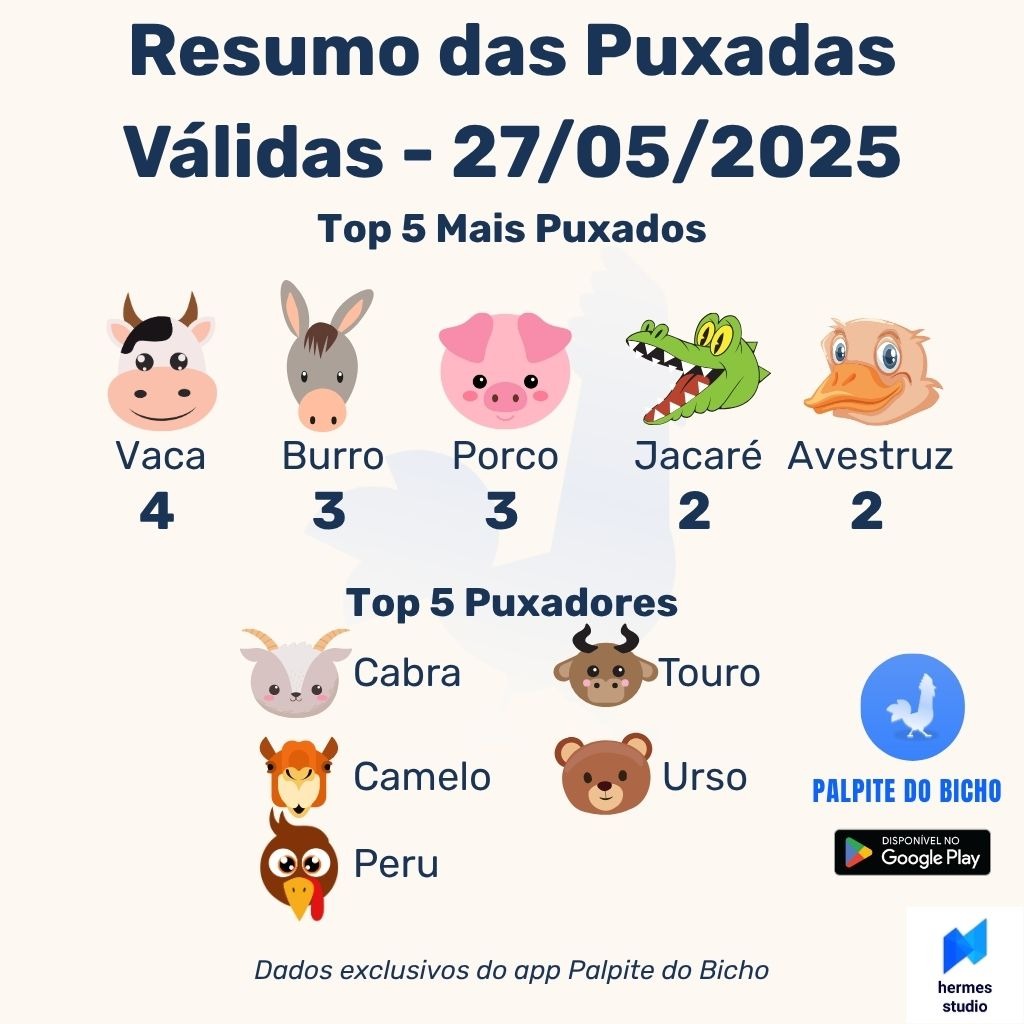 No dia 27 de maio de 2025, foram registradas 22 puxadas válidas em diversas loterias do Brasil, revelando padrões interessantes entre os animais puxadores e os puxados. Confira os destaques do dia: