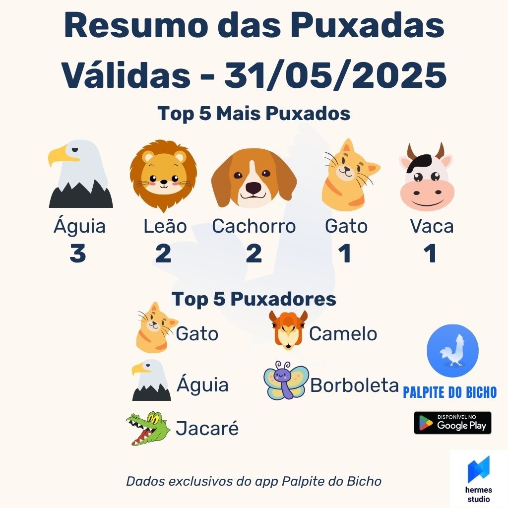 No dia 31/05/2025, foram registradas 14 puxadas válidas no aplicativo. Abaixo, você confere os destaques mais importantes do dia: