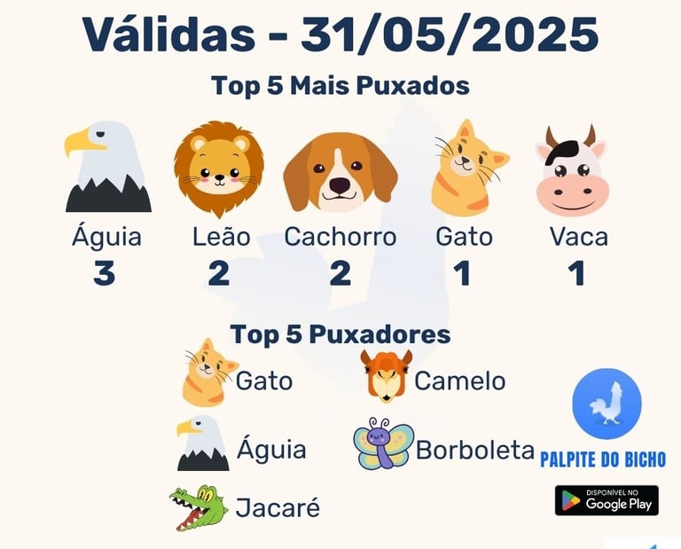 A Águia tem mostrado força e regularidade, aparecendo com destaque por dois dias seguidos. Isso pode indicar uma fase quente do bicho, o que merece atenção. O Gato, apesar de discreto, teve relevância como puxador — um bom sinal para quem aposta nas puxadas indiretas.
